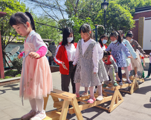 习近平总书记在调研时曾说过,“文明其精神,野蛮其体魄,我说的‘野蛮其体魄’就是强身健体。”幼儿园充分发挥专业优势,带领小朋友们在社区广场上进行体育大循环活动,体育大循环设置了攀爬、翻滚、跳跃等环节,充满趣味又极具挑战性,大家虽然是第一次玩,有些胆怯,但志愿者老师的鼓励帮助下,成功完成了整个循环过程。