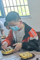 心心点灯志愿服务队为小朋友们带来了制作手工蛋糕的原材料,小朋友们自己动手制作蛋糕,大家又兴奋又开心,都有模有样地抹果酱,糊奶油,用巧克力碎、小饼干、小蛋卷装饰蛋糕,心情快乐到起飞!