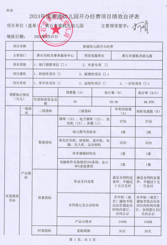 九、2024年度新建幼儿园开办经费项目绩效自评表