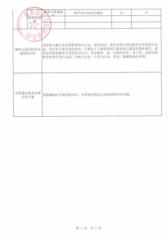 一、2024年度黄石市政府机关幼儿园整体绩效评价自评表或(报告)