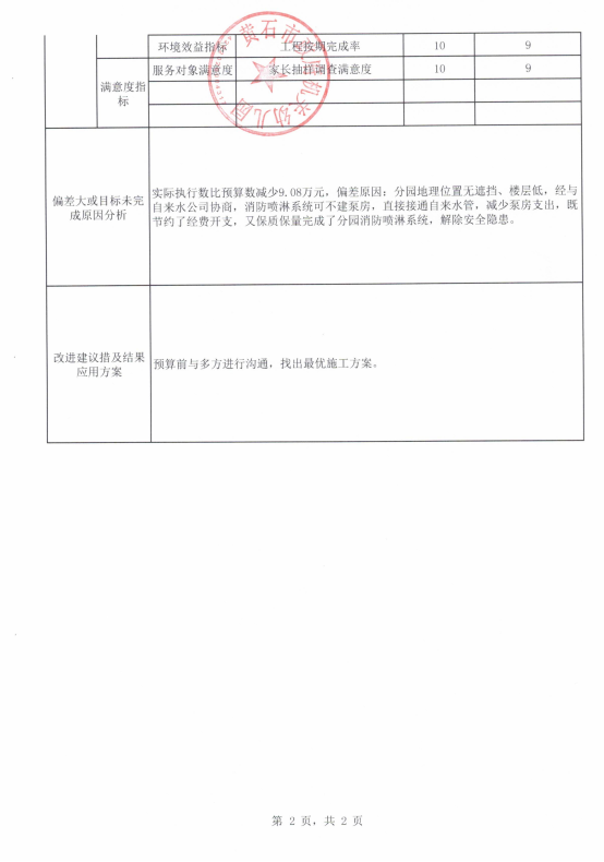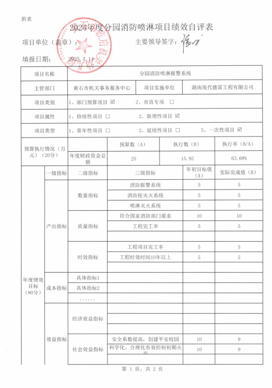 分园消防喷淋报警系统项目绩效自评综述:项目全年预算数为25万元,执行数为15.92万元,完成预算63.9%。主要产出和效益:一是分园消防场所全部按期完成,验收质量合格,符合国家消防部门要求;二是该工程能够有效科学的控制初期火苗,校园安全系数提高,创建了平安校园。发现的问题及原因:实际支付低于预算数,主要是分园地理位置无遮挡、楼层低,经与自来水公司协商,消防喷淋系统可不建泵房,直接接通自来水管,减少泵房支出,既节约了经费开支,又保质保量完成了分园消防喷淋系统,解除安全隐患。下一步改进措施:预算前多余相关部门沟通,做好预算计划,安排工程量及预算资金。